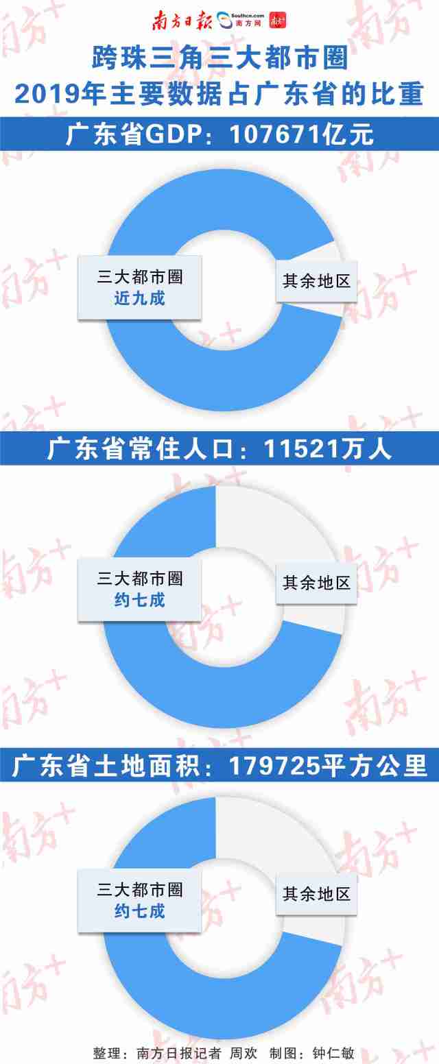 南方城市智庫梳理發(fā)現(xiàn),去年廣州、深圳、珠江口西岸三大都市圈的經(jīng)濟總量超過9萬億元,占全省近九成;常住人口、土地面積均占全省約七成。