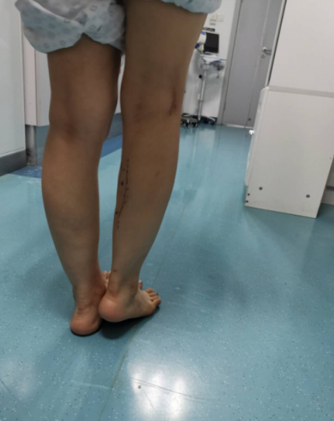 20歲出頭的楊柳(化名)右小腿注射肉毒素后發(fā)生肌肉攣縮,導(dǎo)致右足跟不能著地,雙下肢不等長,跛行。