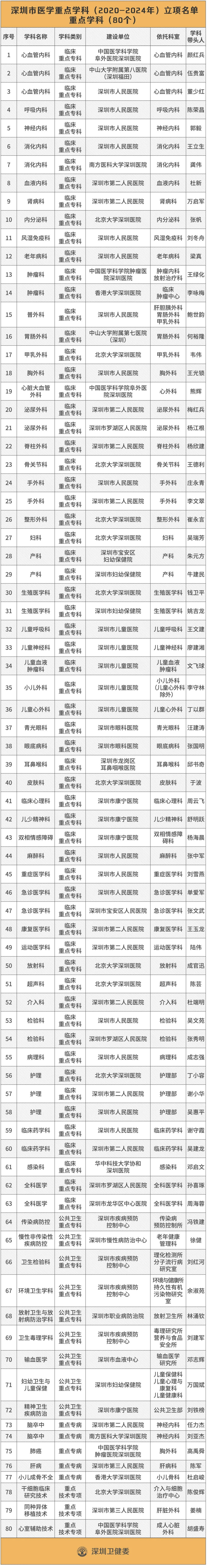 80個(gè)重點(diǎn)學(xué)科都是從全市所有衛(wèi)生健康機(jī)構(gòu)中選出,通過深圳市衛(wèi)健委組織的評(píng)審,結(jié)合學(xué)科基礎(chǔ)條件、??品?wù)能力、建設(shè)成效等因素確定。