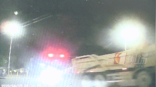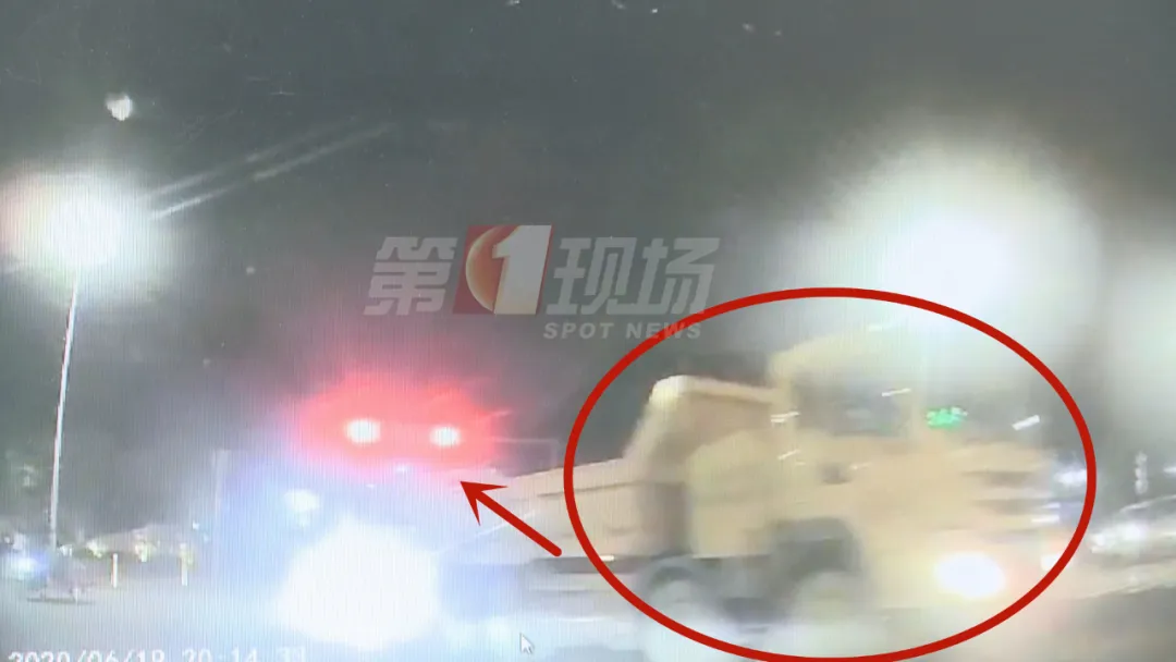 事故發(fā)生在6月19號晚上8點(diǎn)多,可以看到黑色小車在信號燈開始閃爍的時(shí)候開過光僑路路口,正好被一輛左轉(zhuǎn)泥頭車擋住了路。