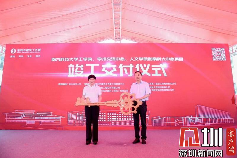 深圳市建筑工務(wù)署署長(zhǎng)喬恒利向南方科技大學(xué)黨委書記郭雨蓉移交鑰匙牌。
