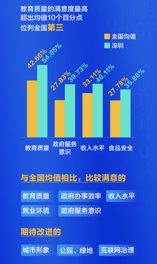 在針對(duì)城市治理能力和社會(huì)服務(wù)的20多項(xiàng)滿(mǎn)意度指標(biāo)中,深圳有19項(xiàng)高于全國(guó)省會(huì)城市和直轄市平均水平。其中,市民對(duì)教育服務(wù)的滿(mǎn)意度最高,超出均值10個(gè)百分點(diǎn),位列全國(guó)第三,其次是治安狀況和水、空氣質(zhì)量,而在政府服務(wù)意識(shí)和食品安全的滿(mǎn)意度,也排在全國(guó)同類(lèi)第一名。此外,日常生活中的收入和就業(yè),也讓深圳人感覺(jué)比較踏實(shí)。
