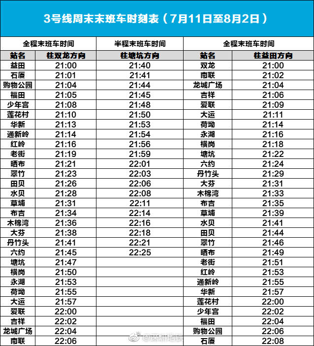 7月11日至8月2日 深圳地鐵3號(hào)線周末晚上9點(diǎn)結(jié)束運(yùn)營