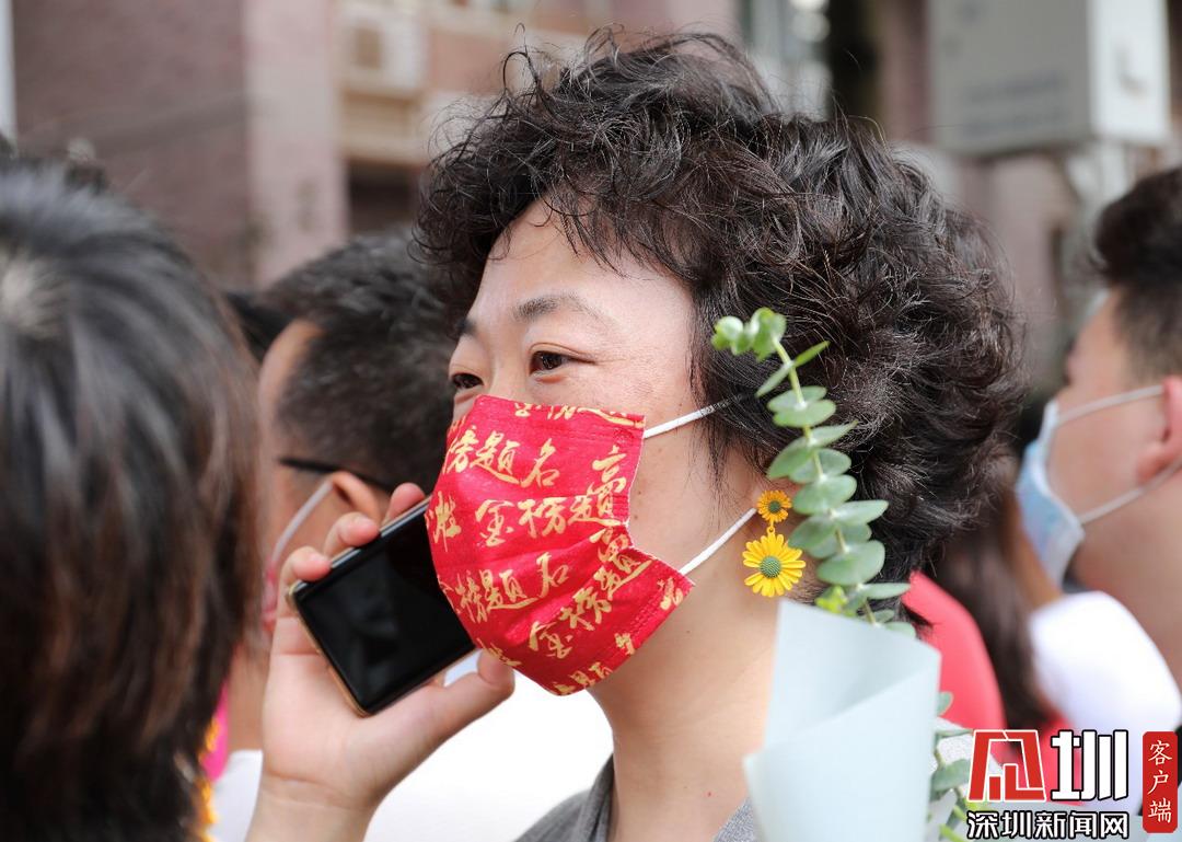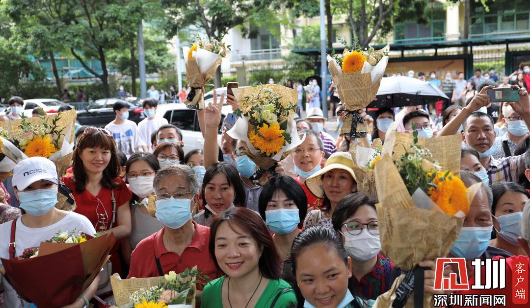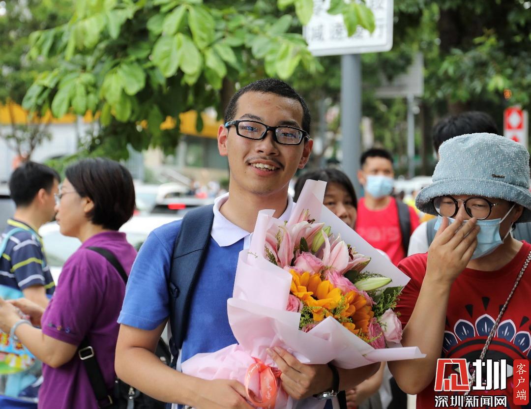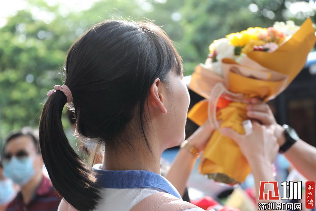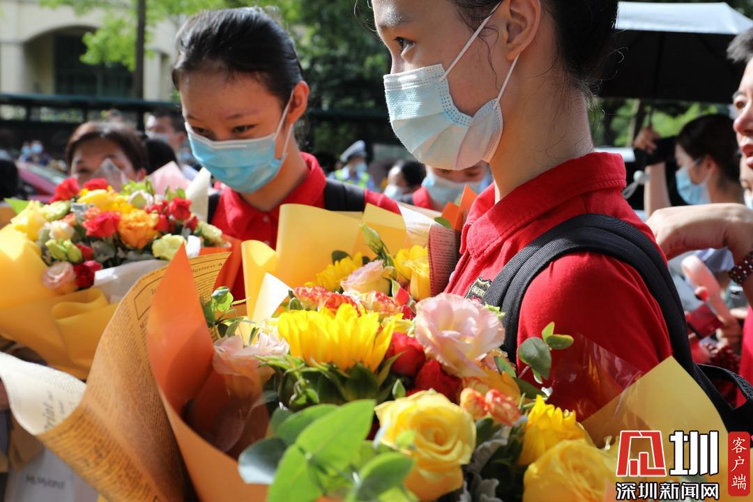 深圳高級(jí)中學(xué)考點(diǎn)外家長受捧鮮花、滿懷期待。