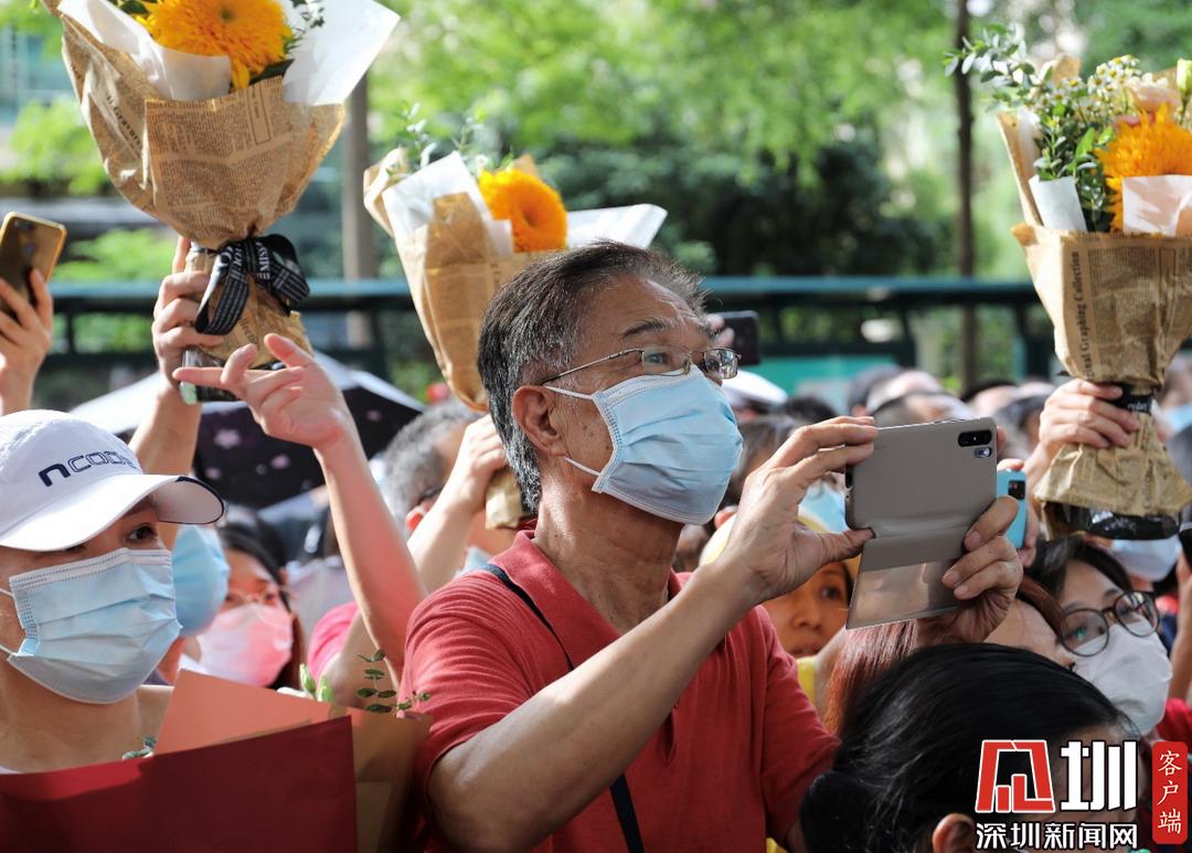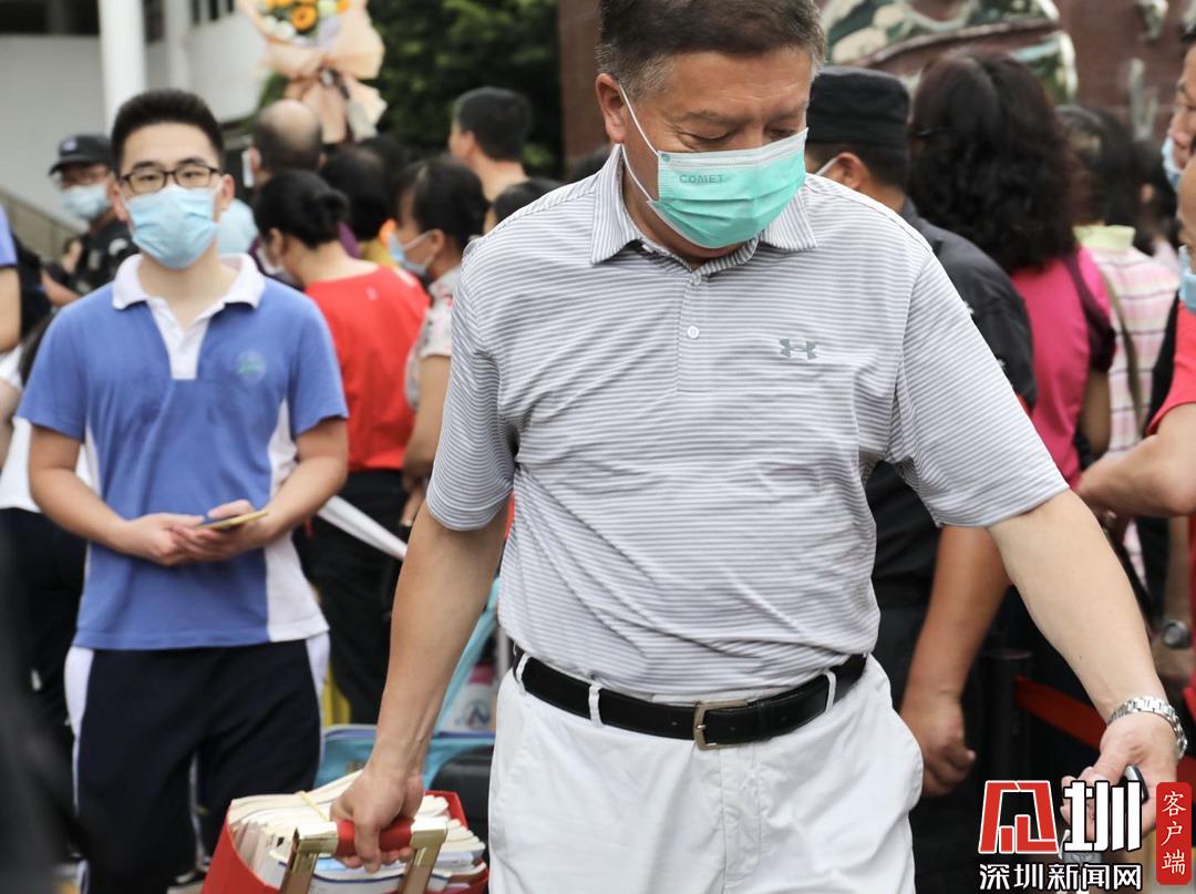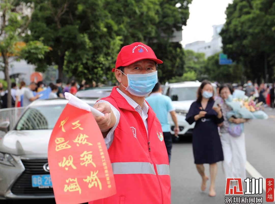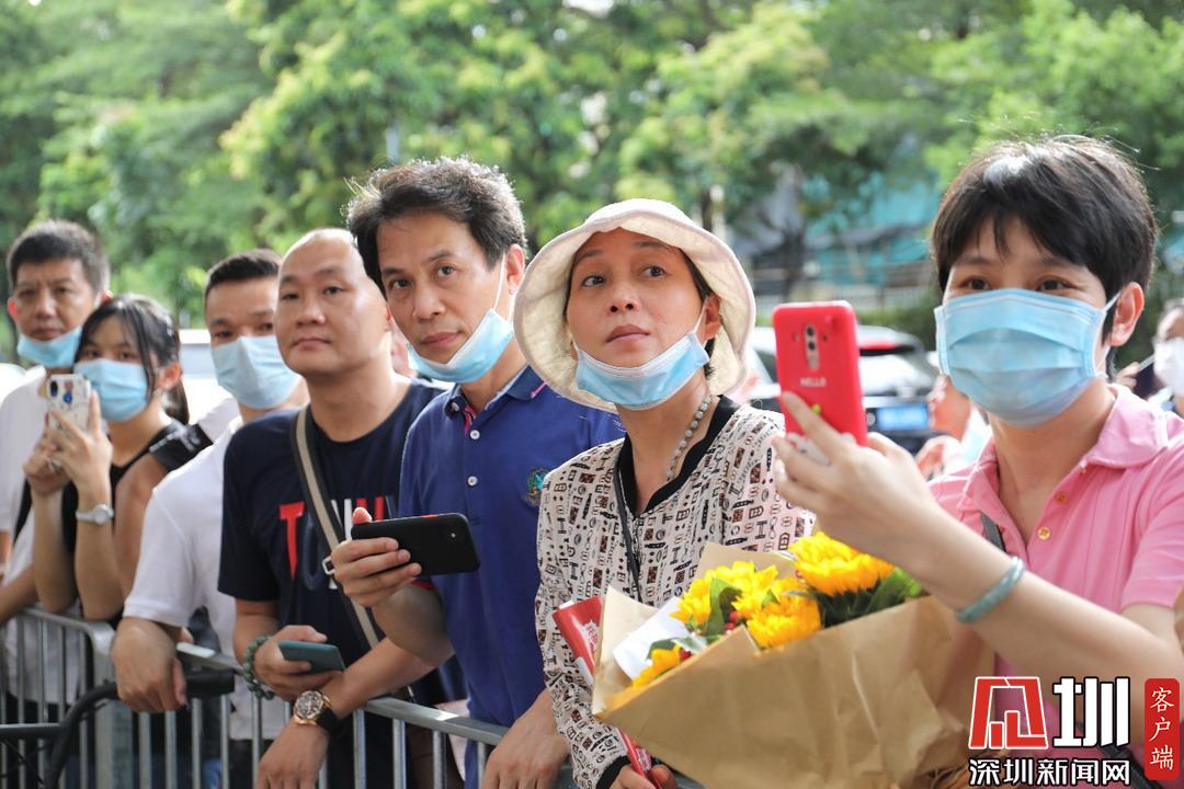 深圳高級(jí)中學(xué)考點(diǎn)外家長受捧鮮花、滿懷期待。