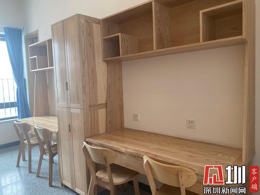 宿舍樓內(nèi),每套學(xué)生宿舍41.8平方米,采用2+1模式,2個(gè)獨(dú)立的房間各居住4人,一個(gè)共用衛(wèi)生間。一方面做到干濕分區(qū),臥室舒適度更好;另一方面做到學(xué)生分散,臥室靜謐性更好。同時(shí),室內(nèi)家具均采用“全實(shí)木+環(huán)保水性漆”,包括床、衣柜、書桌、書柜與椅子等;每一層宿舍樓均設(shè)有觀景平臺(tái)。此外,宿舍配備空調(diào),太陽(yáng)能熱水器,并在每棟宿舍二樓都設(shè)置了自助洗衣房。