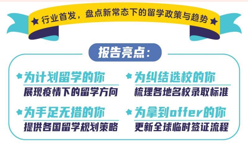 在數(shù)字網(wǎng)絡化技術加強全球合作的大背景下,人才的全球化早已成為時代的必然要求。然而面對今年疫情帶來的變動,當下留學規(guī)劃如何破局、高考后全球升學有機會嗎、留學生就業(yè)變化在哪等問題,也成為留學家庭關心的重點。為幫助更多留學生家庭全面盤點新常態(tài)下的留學政策與趨勢、梳理最新錄取標準、做好“學業(yè)”“安全”雙重保障,7月18日09:00-10:00啟德教育還將在線重點發(fā)布《新常態(tài)下的留學現(xiàn)狀報告》,這也將是留學行業(yè)相關報告的首次發(fā)布。
