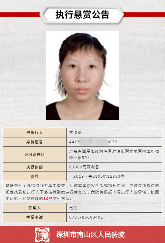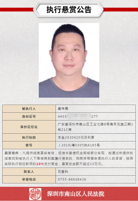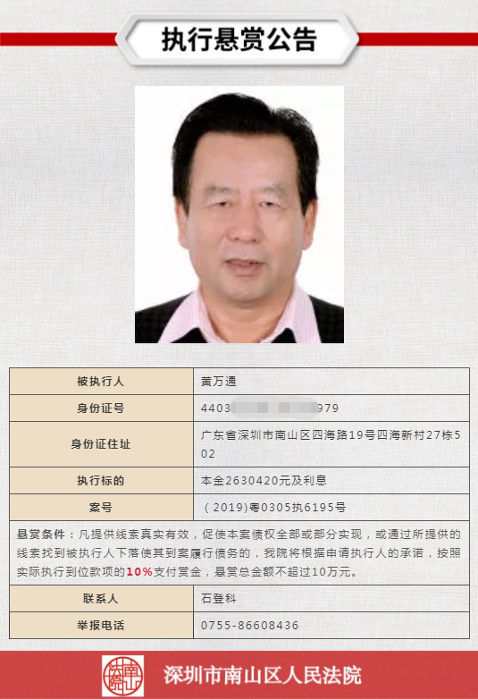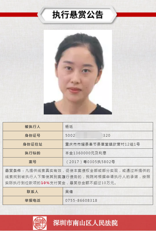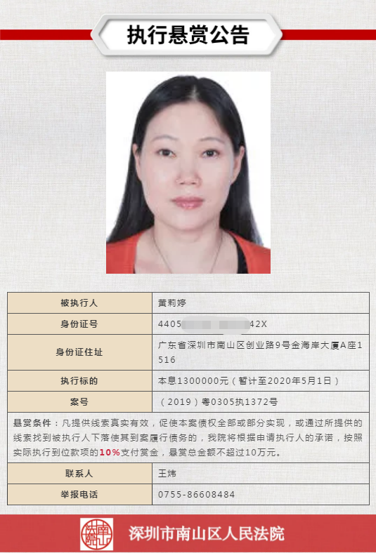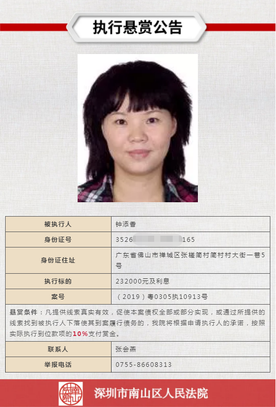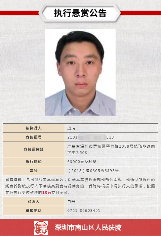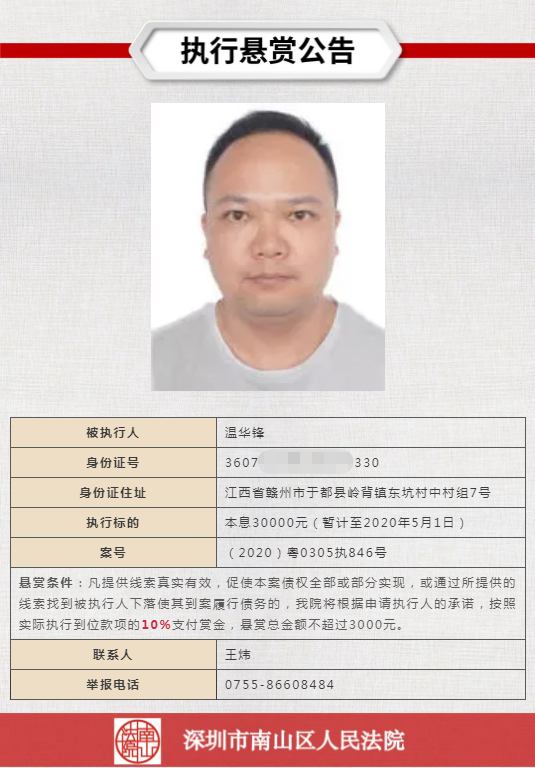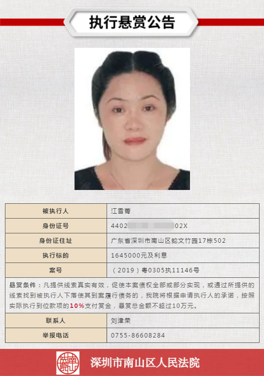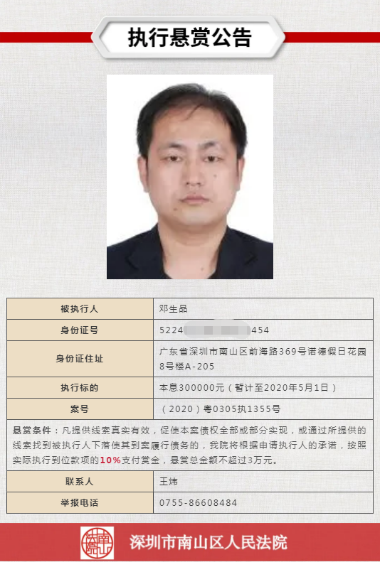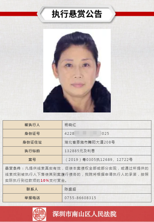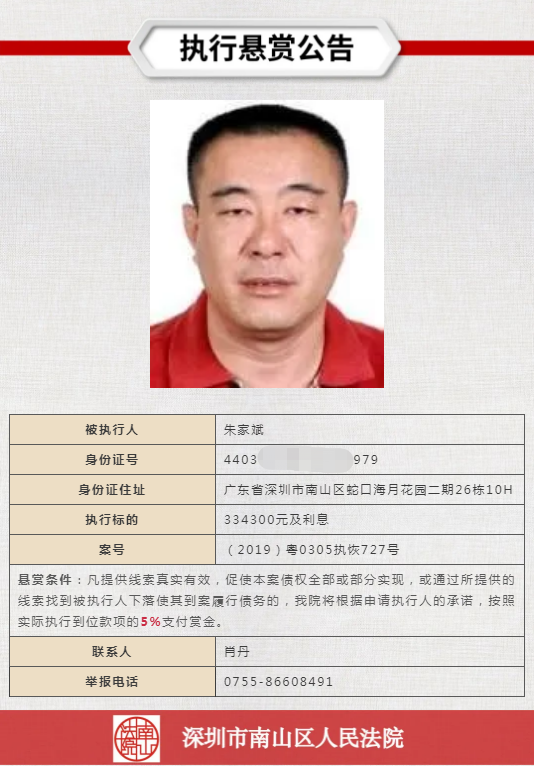 經(jīng)申請(qǐng)執(zhí)行人申請(qǐng),深圳市南山區(qū)人民法院向社會(huì)發(fā)布懸賞舉報(bào)公告,凡提供線索真實(shí)有效,促使本案?jìng)鶛?quán)全部或部分實(shí)現(xiàn),或通過所提供的線索找到被執(zhí)行人下落使其到案履行債務(wù)的,深圳市南山區(qū)人民法院將根據(jù)申請(qǐng)執(zhí)行人的承諾,按照實(shí)際執(zhí)行到位款項(xiàng)給予一定金額的賞金。