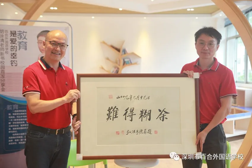 最后,朱正興校長給胡涂清老師贈送了一幅書法匾額作為“賀禮”,上面寫著“難得糊涂”。同時,朱校長也分享了自己的閱讀心得:“特別感謝胡老師,這是百外自成立以來第一位把自己的教育心路歷程以文字的形式集中展示給大家的老師,胡老師是我們的驕傲,也是我們學(xué)習(xí)的榜樣,是百外教育工作者的寫照縮影!胡老師對教育的堅守,對夢想的執(zhí)著追求,在重復(fù)輪回的工作中,做著統(tǒng)一卻又與眾不同的事,做成了教育詩歌,做成了教育散文。胡老師安靜卻不安分,清醒中保持一份糊涂,幾分激情,更有滿懷的豁達……”