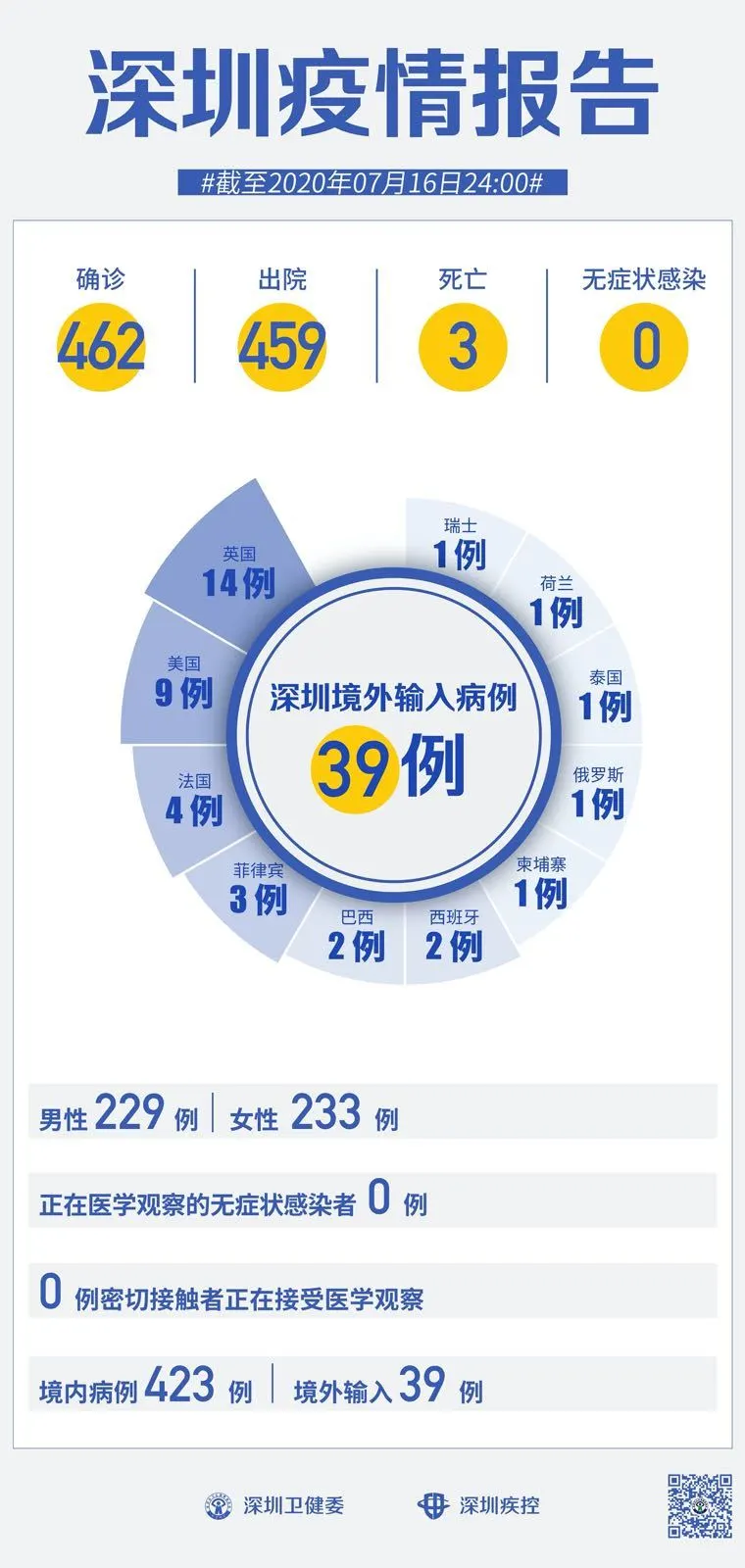 截至7月16日24時,深圳累計報告新冠肺炎病例462例。