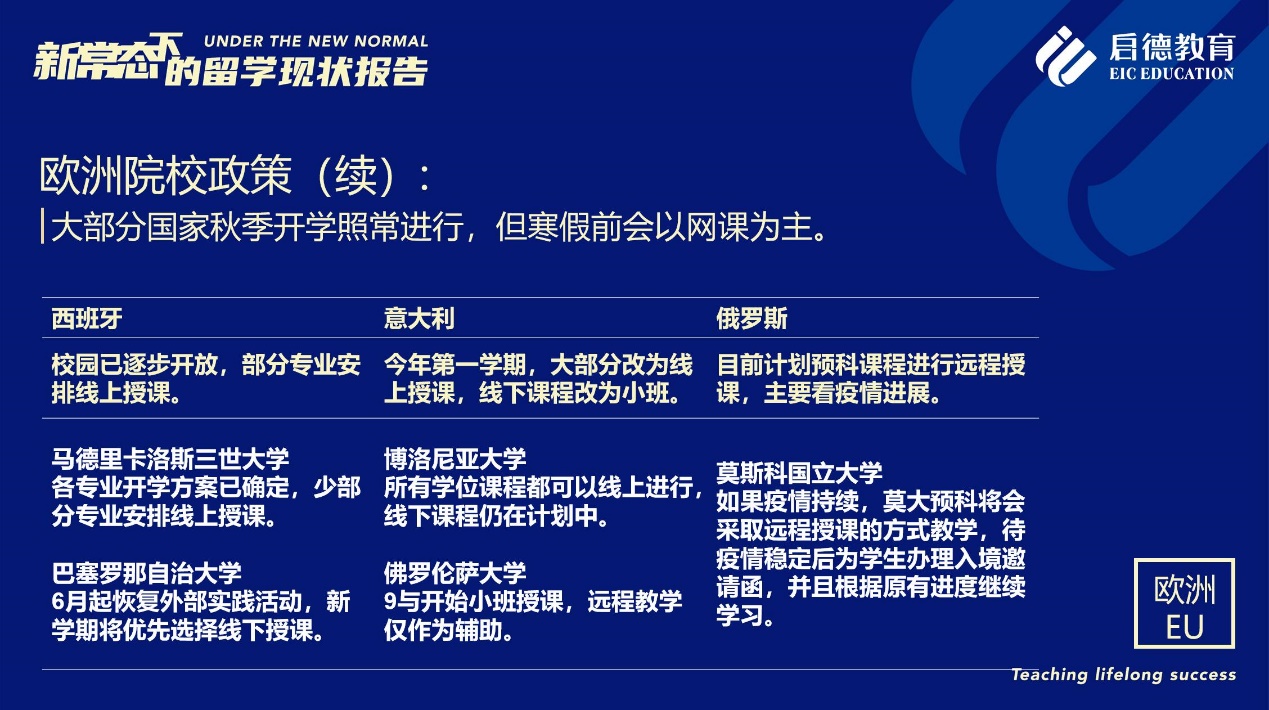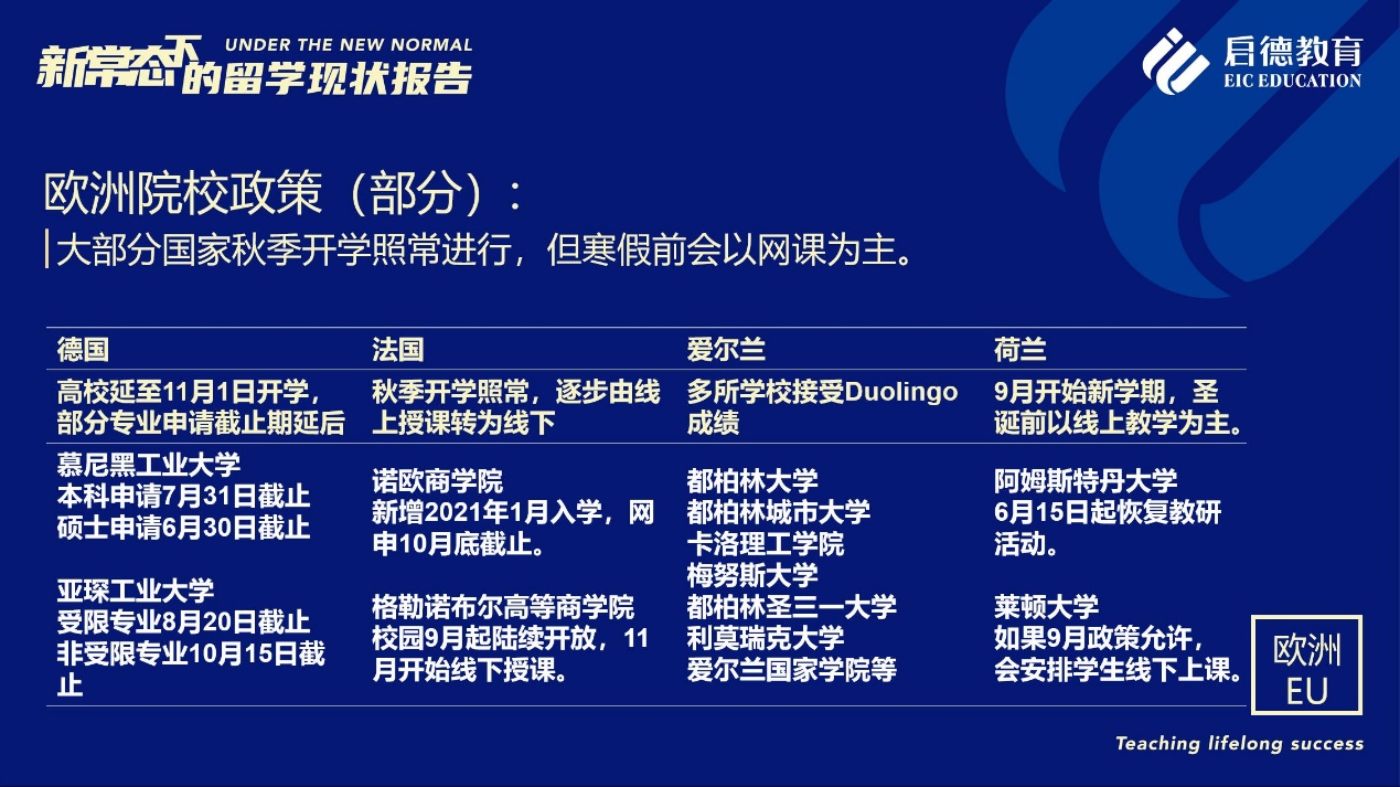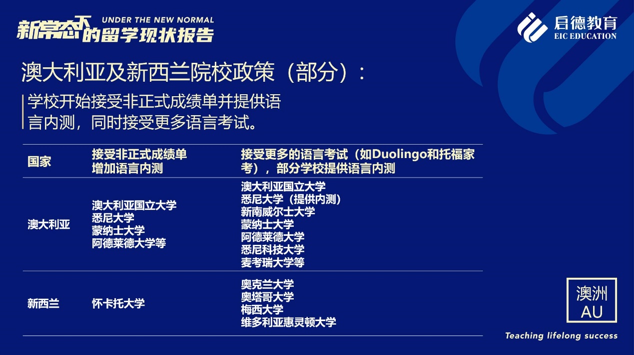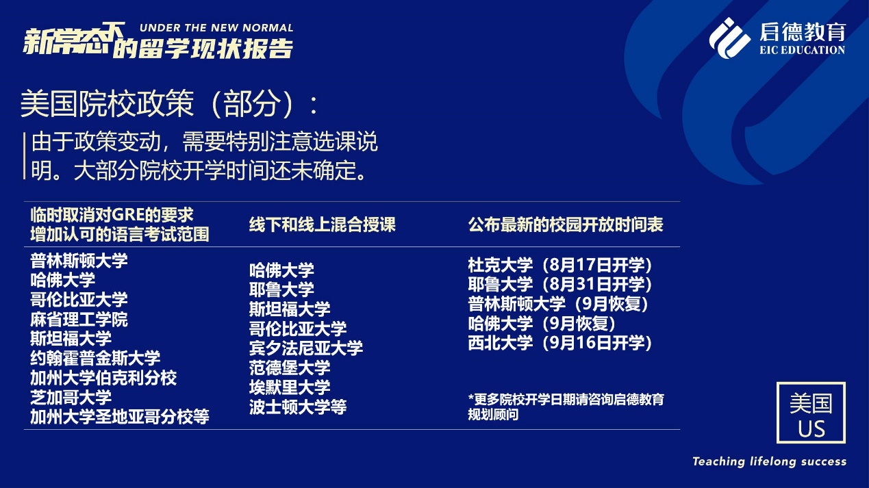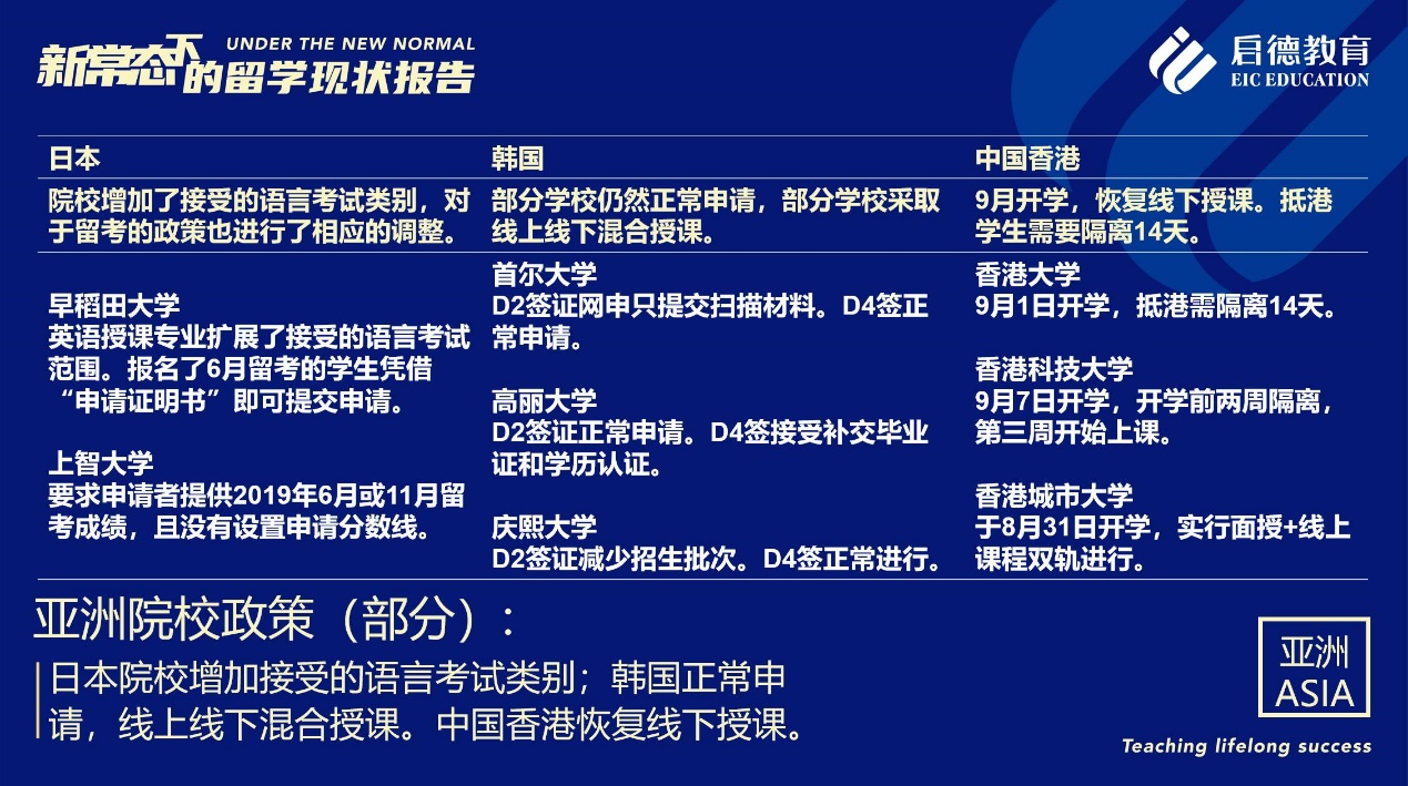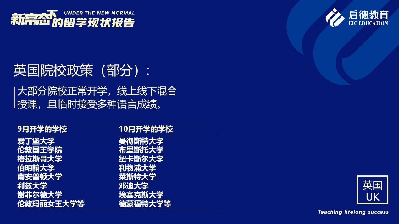 《報(bào)告》也梳理了近期各主要留學(xué)目的國及院校針對(duì)國際學(xué)生出臺(tái)的各類政策。據(jù)啟德留學(xué)英愛項(xiàng)目總監(jiān)孫波介紹,國內(nèi)英國簽證中心已經(jīng)重新開放。準(zhǔn)備赴英讀研的學(xué)生,部分大學(xué)明確表示秋季可以正常開學(xué),大課將會(huì)采用線上授課的方式,小班授課線下進(jìn)行;還有部分大學(xué)向?qū)W生提供更加靈活的入讀方案,學(xué)生可以選擇9月入讀或者1月入讀。此外,從2021年開始,在英國完成博士學(xué)位的國際學(xué)生將會(huì)獲得3年有效期的 PSW工作簽證,本科生和碩士生可以獲得2年有效期的 PSW工作簽證。