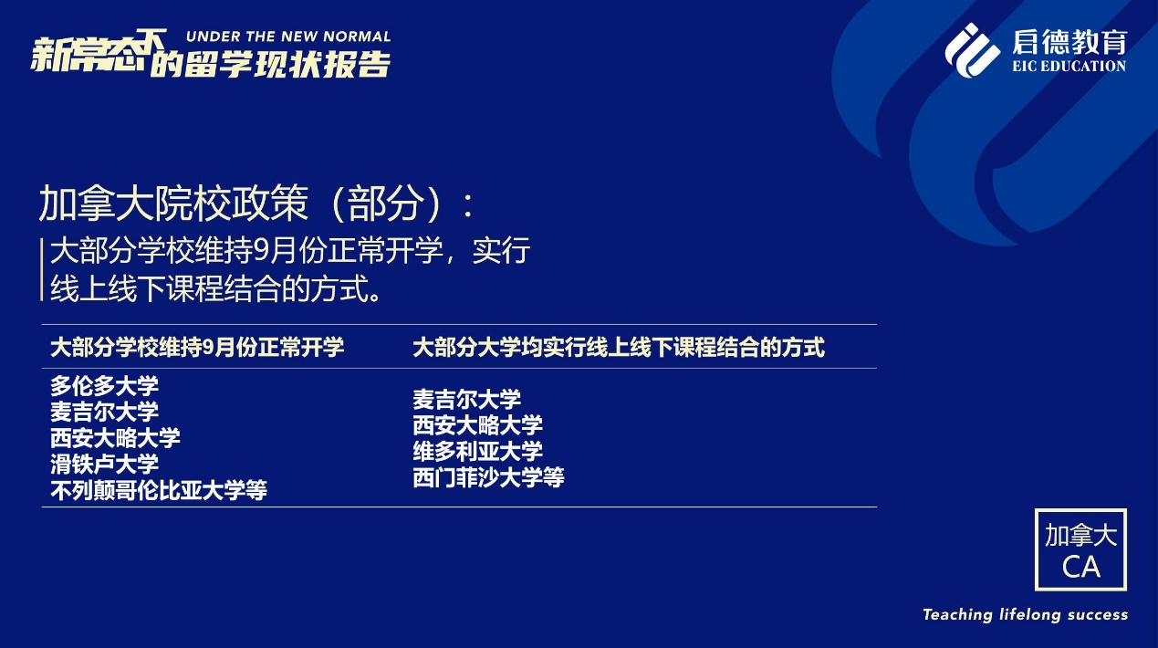 據(jù)啟德留學(xué)加拿大項(xiàng)目總監(jiān)羅瓊介紹,加拿大移民局近日宣布了有關(guān)留學(xué)生學(xué)簽的三項(xiàng)政策,一是優(yōu)先處理材料完整的學(xué)簽申請(qǐng);二是實(shí)施兩個(gè)階段的學(xué)簽審批程序,為遠(yuǎn)程學(xué)習(xí)的學(xué)生提供保障;三是針對(duì)今年秋季開課并于9月15日前提交學(xué)簽申請(qǐng)的留學(xué)生,遞簽后簽證等待和海外網(wǎng)課的時(shí)間可計(jì)入畢業(yè)工作許可的換算時(shí)長(前提是最終獲得簽證且50%的課程在加拿大境內(nèi)完成),此措施使留學(xué)生即使因?yàn)橐咔闊o法提交所有的必需文件,也可以在今年秋季報(bào)名注冊(cè)并線上學(xué)習(xí)。此外,正在加拿大境內(nèi)的留學(xué)生,簽證申請(qǐng)可暫免指紋采集,今年1月后過期的簽證,可不受90天限制,在今年12月31日前都可提交恢復(fù)身份申請(qǐng)。