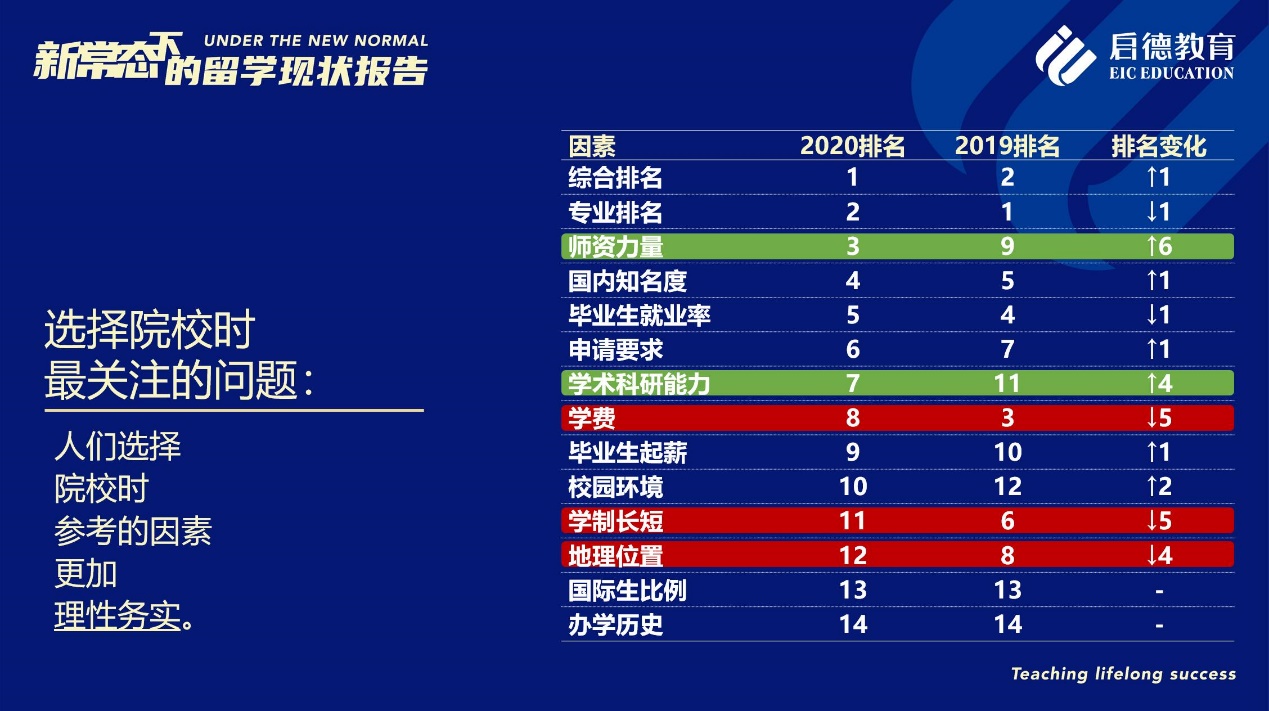 值得關(guān)注的是,在“選擇院校時(shí)最關(guān)注的問題”中,“師資力量”的受關(guān)注度從2019年的第9位上升為第3位,僅次于“綜合排名”與“專業(yè)排名”,“國內(nèi)知名度”與“畢業(yè)生就業(yè)率”分居第4位與第5位,“學(xué)術(shù)科研能力”從2019年的第11位上升至第7位,而“學(xué)費(fèi)”、“學(xué)制長短”與“地理位置”等因素分別下滑至第8位、第11位與第12位??梢娫诰蜆I(yè)形勢(shì)尤其嚴(yán)峻的2020年,意向留學(xué)生對(duì)教育質(zhì)量的剛性需求已進(jìn)一步上升,以期在未來的就業(yè)市場(chǎng)獲得更具戰(zhàn)略優(yōu)勢(shì)的國際競爭力。