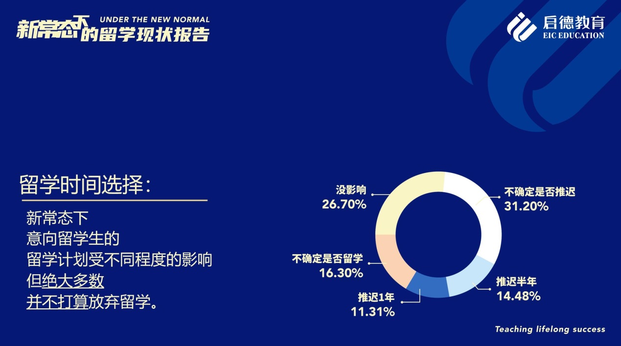《啟德教育新常態(tài)下的留學(xué)現(xiàn)狀報(bào)告 》調(diào)研數(shù)據(jù)顯示,疫情與國際環(huán)境疊加的“新常態(tài)”中,意向留學(xué)生的留學(xué)計(jì)劃不同程度地受到了影響,但大部分的意向留學(xué)生并不打算放棄留學(xué),而主要是在時(shí)間規(guī)劃上進(jìn)行了調(diào)整。參與調(diào)研的意向留學(xué)生中,31.2%表示不確定是否推遲留學(xué)計(jì)劃,26.7%表示沒有影響,14.48%將留學(xué)計(jì)劃推遲半年,11.31%將留學(xué)計(jì)劃推遲一年,16.3 %表示不確定是否繼續(xù)留學(xué)(這之中初中階段的學(xué)生較多)。