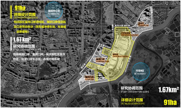 競(jìng)賽由深圳市投資控股有限公司主辦,深港科技創(chuàng)新合作區(qū)發(fā)展有限公司承辦,深圳市規(guī)劃和自然資源局、深圳市建筑工務(wù)署、福田區(qū)人民政府為技術(shù)指導(dǎo)單位,旨在落實(shí)關(guān)于皇崗口岸片區(qū)遴選國(guó)際一流設(shè)計(jì)師進(jìn)行整體設(shè)計(jì)、統(tǒng)一開發(fā)、連片建造的要求,通過“定向邀請(qǐng)5家+資格預(yù)審10家”的方式,遴選了15家國(guó)際知名設(shè)計(jì)機(jī)構(gòu)參賽。其中,詳細(xì)設(shè)計(jì)范圍包括現(xiàn)狀皇崗口岸貨檢區(qū)、口岸生活區(qū)及口岸周邊地塊,面積約0.91平方公里;研究協(xié)調(diào)范圍為河套C區(qū),包括詳細(xì)設(shè)計(jì)范圍及周邊的福田口岸、赤尾村等區(qū)域,面積1.67平方公里。