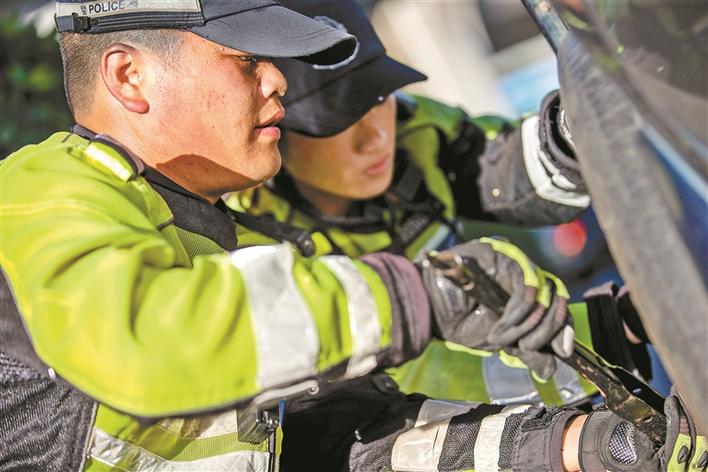 7月19日中午,時(shí)云財(cái)正在南山區(qū)同樂-茶光路口巡邏,看到路邊一位小車司機(jī)焦急地在車旁張望等待,時(shí)云財(cái)和同事林宇明、許爽一起趕過去詢問。原來(lái),陳先生開車途中發(fā)現(xiàn)輪胎爆了,立即停到路邊,但是維修的車輛和人員許久未來(lái),因?yàn)橹壁s著去辦事,情緒有些焦慮。