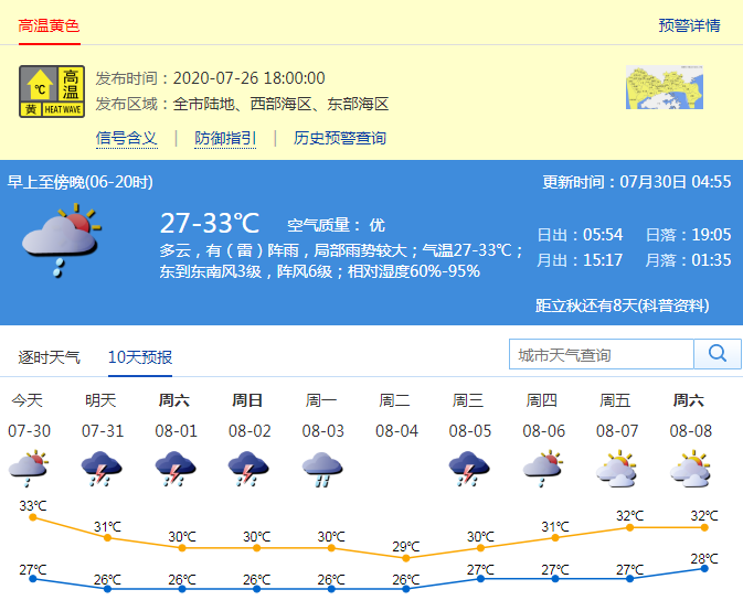 記者從深圳市氣象臺了解到,7月30日多云,有(雷)陣雨,局部雨勢較大。30日夜間至8月1日白天受偏東氣流影響,有間歇性雷陣雨,局部暴雨,雨時伴有短時8級陣風,高溫天氣緩解,2-5日有明顯降雨過程。