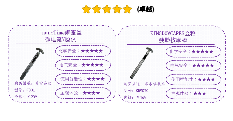 經(jīng)測(cè)試,綜合化學(xué)安全、電氣安全、使用智能性、主觀體驗(yàn)等消費(fèi)者關(guān)心的多個(gè)維度,2款微電流型家用美容儀和1款電離子型美容儀品質(zhì)領(lǐng)跑表現(xiàn)卓越,分別為,國(guó)產(chǎn)品牌nanoTime娜蜜絲F83L微電流V臉儀和KINGDOMCARES金稻 KD9070瘦臉按摩棒;日本品牌Panasonic松下 EH-ST50面部護(hù)理器(溫?zé)犭x子美容儀)。