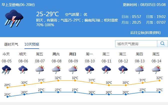 見圳客戶端·深圳新聞網(wǎng)2020年8月5日訊 今日我市陰天,有暴雨;氣溫25-29℃;偏南風(fēng)3級;相對濕度70%-100%。深圳市氣象臺于2020年8月5日5時15分在全市發(fā)布雷電預(yù)警,今天上午海上將不斷有降雨云團生成,受其影響我市有零散雷暴;未來6小時累計雨量將達暴雨,深圳市氣象臺于2020年8月5日5時40分在全市發(fā)布暴雨黃色預(yù)警,全市進入暴雨戒備狀態(tài),需注意防范。市民停留在安全地方;按照防御預(yù)案停止戶外易燃易爆危險作業(yè),并加強?;瘓鏊踩芾?。