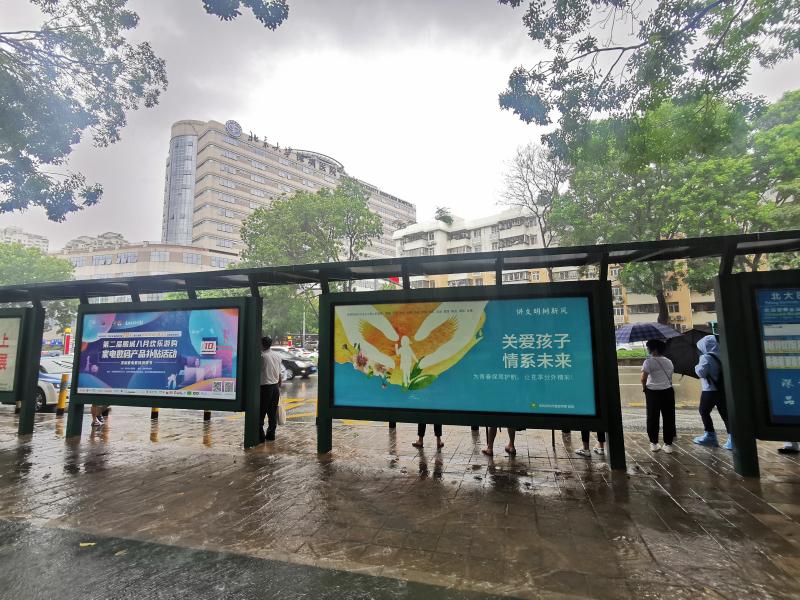北大醫(yī)院公交站臺等車的乘客撐起了傘,穿好雨衣。(記者張玲 攝)