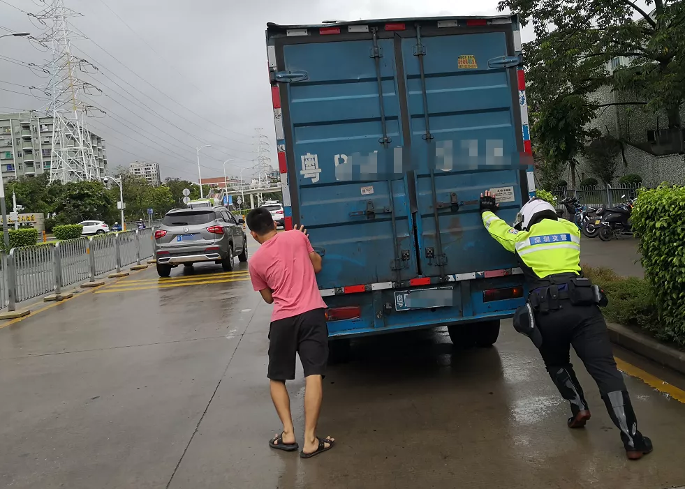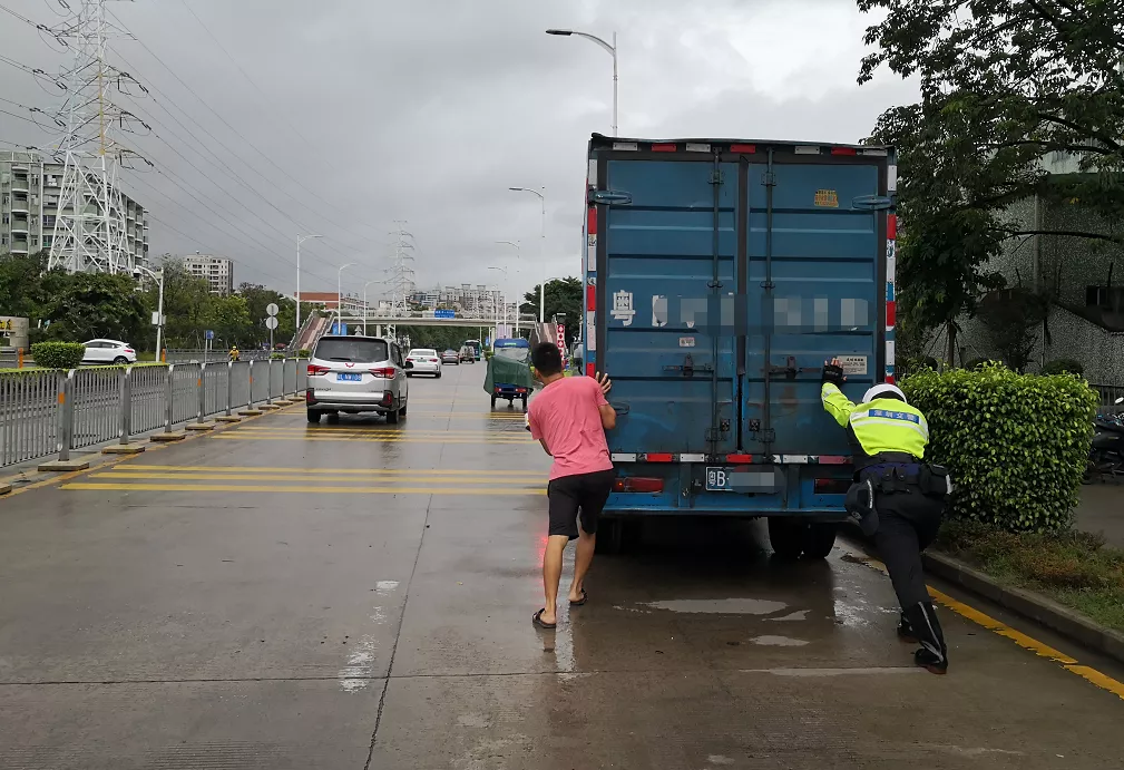 8月5日9時30分許,深圳交警鐵騎隊員雨中巡邏至新沙路時,發(fā)現(xiàn)德昌電機廠路段有一輛貨車停在路上,導(dǎo)致交通擁堵。貨車司機在旁,鐵騎上前詢問情況后得知貨車故障,司機被迫將車停在路邊。