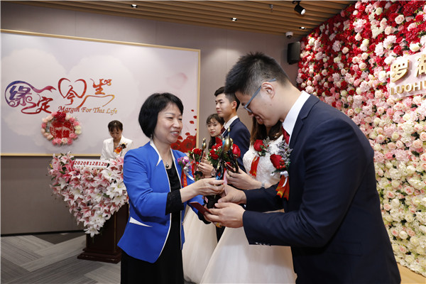 據(jù)悉,結(jié)婚登記頒證儀式是羅湖區(qū)民政局為了推崇簡約適度、文明向上的婚俗禮儀,倡導(dǎo)健康家庭倫理、婚姻文化、文明婚俗,培育好家風(fēng)、傳承好家風(fēng),為結(jié)婚新人提供的免費服務(wù)。