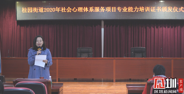 12月17日上午,中國心理衛(wèi)生協(xié)會理事、深圳市社會主義先行示范區(qū)專家、深圳市社會心理服務(wù)協(xié)會副會長張小梨,桂園街道辦事處副主任、公共服務(wù)辦公室主任林宣妤,桂園街道辦事處民生事務(wù)部部長王羽飛為66名通過考核的社會心理服務(wù)人員頒發(fā)證書。