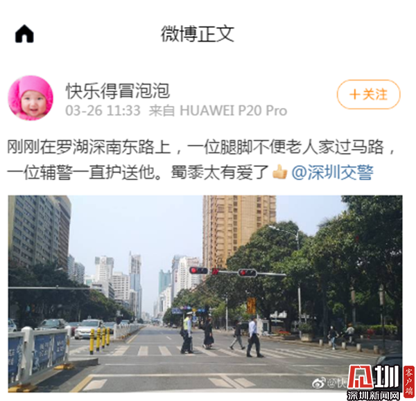 隨后,湊巧看到這一幕的網(wǎng)友將輔警護(hù)送老人過馬路的照片在微博上發(fā)布并配文:“剛剛在羅湖深南東路上,一位腿腳不便的老人家過馬路,一位輔警一直護(hù)著他。蜀黍太有愛了“。路過的行人也對(duì)交警這一暖心的小舉動(dòng)贊不絕口,大家紛紛贊揚(yáng)羅湖交警是暖心正能量。