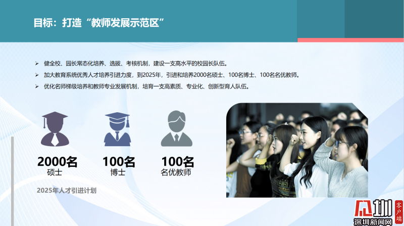 在人才隊(duì)伍方面,實(shí)施“領(lǐng)鷹工程”,建設(shè)一支高水平的校園長(zhǎng)隊(duì)伍。優(yōu)化名師梯級(jí)培養(yǎng)和教師專業(yè)發(fā)展機(jī)制,培育一支高素質(zhì)、專業(yè)化、創(chuàng)新型育人隊(duì)伍。到2025年,羅湖將引進(jìn)和培養(yǎng)2000名碩士、100名博士、100名名優(yōu)教師,建立教科研博士工作站。