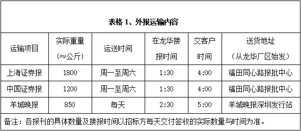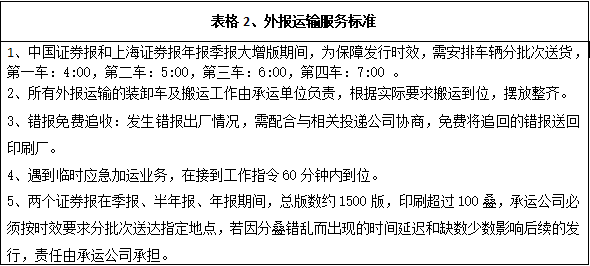 深圳報業(yè)集團印務有限公司現(xiàn)承印外報主要有上海證券報、中國證券報、羊城晚報等重要報刊,根據(jù)各報刊的具體要求,安全、準時、保質、保量地運送每天生產發(fā)行數(shù)量的各報刊到指定地點或客戶手中,具體運輸發(fā)行內容和標準詳見下面表格。