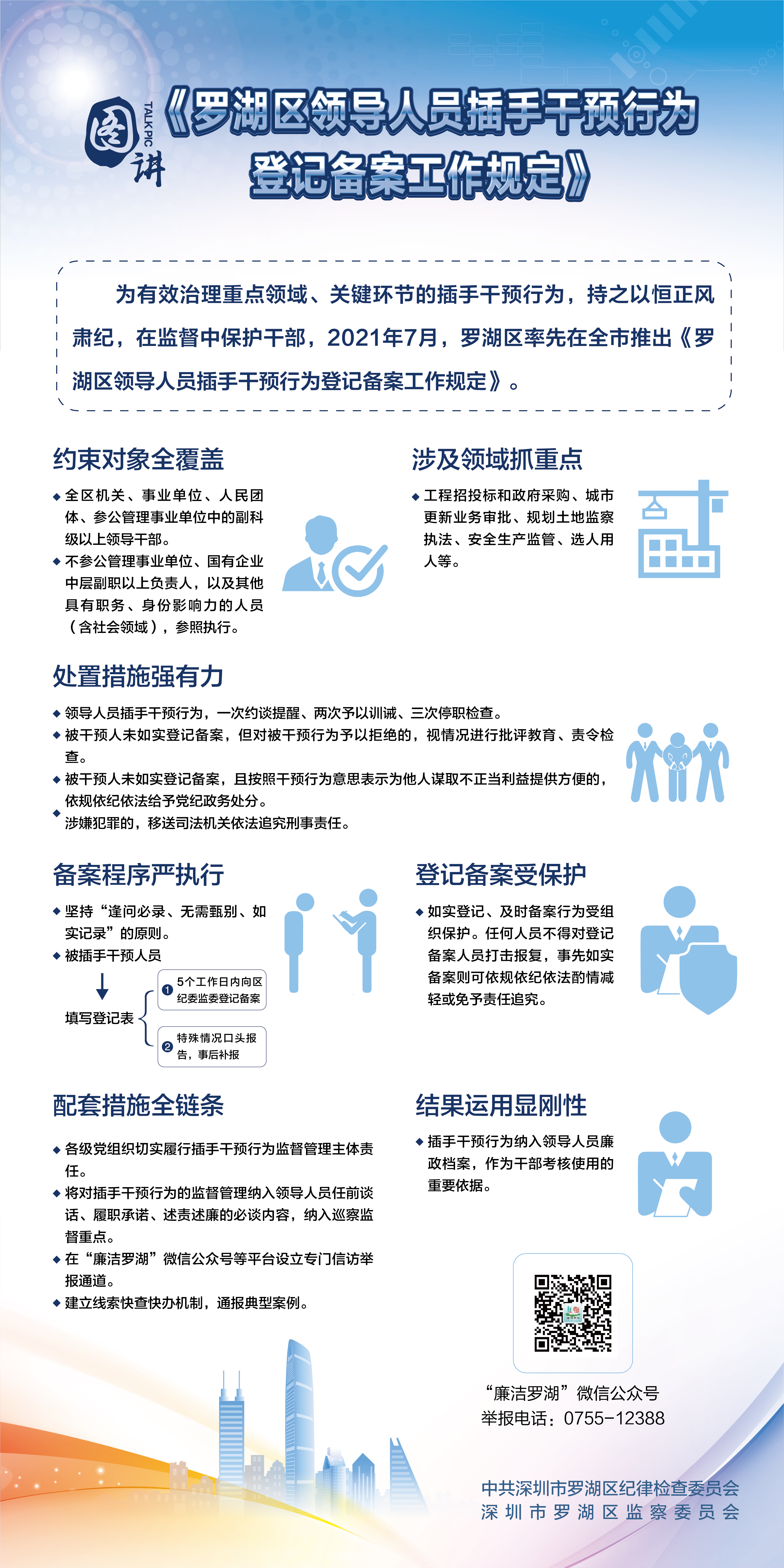 為防范廉政風(fēng)險(xiǎn),在全社會(huì)營造不插手干預(yù)的良好氛圍,羅湖區(qū)紀(jì)委監(jiān)委推動(dòng)出臺(tái)《羅湖區(qū)領(lǐng)導(dǎo)人員插手干預(yù)行為登記備案工作規(guī)定》,從工程招投標(biāo)及政府采購、城市更新業(yè)務(wù)審批、規(guī)劃土地監(jiān)察執(zhí)法、安全生產(chǎn)監(jiān)管、選人用人等五個(gè)重點(diǎn)領(lǐng)域入手,對(duì)全區(qū)機(jī)關(guān)事業(yè)單位和社會(huì)領(lǐng)域插手干預(yù)行為進(jìn)行約束,對(duì)“打招呼”堅(jiān)決說“不”。