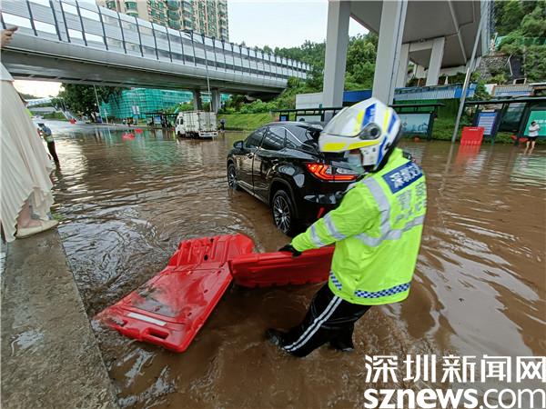 暴雨突襲,蓮塘片區(qū)羅沙路、沿河路羅芳立交積水嚴(yán)重,因排水能力較弱,許多車輛困在積水中無法通行,羅湖交警大隊(duì)機(jī)訓(xùn)中隊(duì)民警李勝軍和李作祥分別組織隊(duì)員開展救援行動(dòng)。