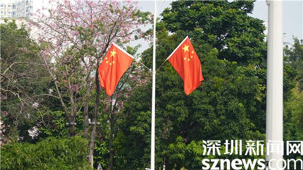 社區(qū)公園盛放的花朵、蔥翠的樹木,映襯得紅旗越發(fā)鮮艷。