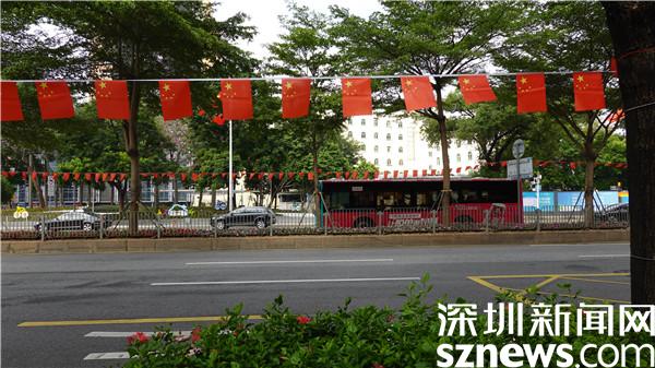 嘉賓路上,掛滿鮮艷紅旗,隨風飄揚。