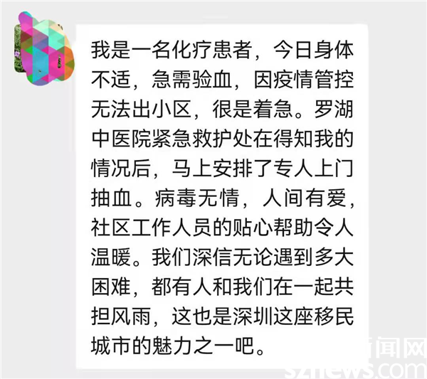 葉先生在護士為他抽血離開之后,送上了真摯地感謝。“無論我們遇到多大的苦難總會有人和我們一起共擔風雨,這就是深圳的魅力”,葉先生說到。