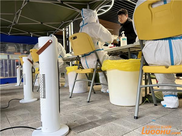 十分鐘后,物資配送車輛來到萬科里核酸檢測點(diǎn),工作人員將熱乎乎的姜茶送到工作人員手中,并熟練地尋找合適的地方架起暖風(fēng)機(jī)?!皬闹苣┑呐瘜殞殻浇裉斓呐L(fēng)機(jī),暖心行動一再升級,感覺很驚喜?!绷_湖醫(yī)院護(hù)士劉新媚向記者說道,目前疫情防控工作任務(wù)艱巨,檢測點(diǎn)周末也在連續(xù)運(yùn)轉(zhuǎn),但街道及時(shí)的物資保障,讓所有一線人員都感覺很暖心。