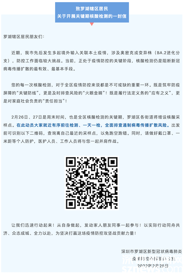 讀特客戶端·深圳新聞網(wǎng)2022年2月26日訊(記者 覃鈺清)2月25日晚,羅湖區(qū)新型冠狀病毒肺炎疫情防控指揮部辦公室發(fā)出《致羅湖轄區(qū)居民關(guān)于開展關(guān)鍵期核酸檢測的一封信》,該信函指出,本周末(2月26日、27日)是全區(qū)核酸檢測的關(guān)鍵期,全區(qū)各街道共設(shè)置200個核酸采樣點(diǎn),動員轄區(qū)所有居民就近有序前往檢測、一天一檢,全面排查遏制病毒傳播擴(kuò)散風(fēng)險。26日上午,記者前往羅湖區(qū)桂園街道實地探訪核酸檢測開展情況。