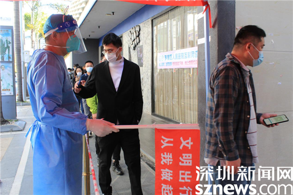 在2月份剛開(kāi)始做義工的那幾天,深圳遭遇寒潮,他衣衫單薄,舉著粵核酸碼的牌子,手都凍僵了。但當(dāng)社工問(wèn)他冷不冷,要不要回去添加衣服時(shí),他都說(shuō)不冷。曾勇林不愿離開(kāi)崗位,因?yàn)橛辛怂囊龑?dǎo)、維持,有他協(xié)助操作手機(jī),來(lái)檢測(cè)的居民就可以縮短檢測(cè)的時(shí)間,就不用挨冷受凍,其他志愿者就可以得到休息。曾勇林寧愿一個(gè)人凍著冷著,也要讓更多人受益。