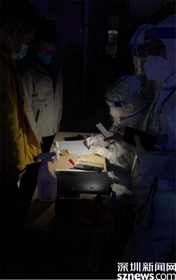 ▲臨時工作場所尚未配備照明設(shè)備,下沉干部打著手機閃光燈登記居民采樣信息