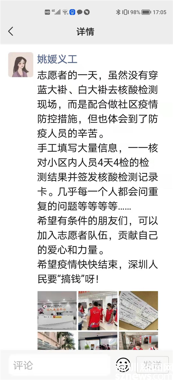 她在朋友圈呼吁:“希望有條件的朋友們,可以加入志愿者隊伍,貢獻自己的愛心和力量。”她說,她所供職的優(yōu)合集團已經組織了122人的志愿隊伍,分布在全市各區(qū),奮力投身全市抗疫戰(zhàn)斗。雖然做志愿者很辛苦,但她不忘調侃:希望疫情快快結束,深圳人民要“搞錢”呀!