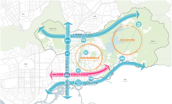 “一主”是以深南東路為中軸線,高起點打造總部經(jīng)濟主廊道?!皟蓞^(qū)”是高品質(zhì)建設(shè)國際消費服務核心區(qū)和文化生態(tài)休閑區(qū)?!叭龓А笔歉吣芗壱?guī)劃深港口岸經(jīng)濟帶、紅嶺新興金融產(chǎn)業(yè)帶和大梧桐新興產(chǎn)業(yè)帶。