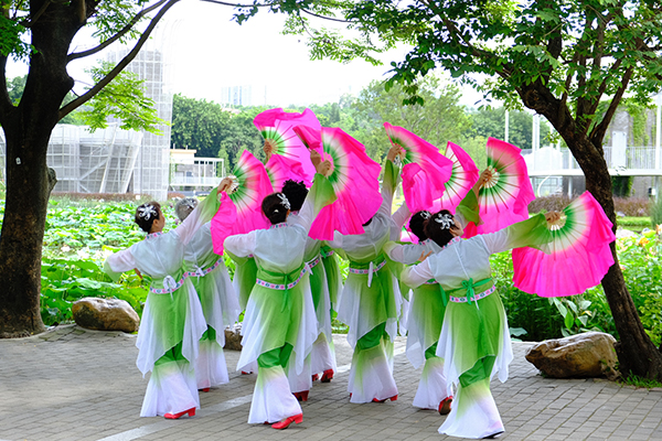 走進(jìn)公園,映入眼簾的是一望無(wú)際的荷葉。一陣微風(fēng)拂過,嫩綠的蓮蓬輕輕點(diǎn)頭,碩大的荷葉隨風(fēng)搖擺,讓人心曠神怡。荷塘邊,身著紅色連衣裙的阿姨們正隨著音樂舞動(dòng);池塘的另一頭,身著碧綠服裝的阿姨們熱情洋溢地表演著扇子舞。