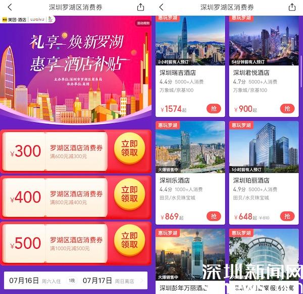 讀特客戶端·深圳新聞網(wǎng)2022年7月16日訊(記者 覃鈺清)7月16日,羅湖區(qū)會同羅湖區(qū)酒店行業(yè)協(xié)會、美團推出“禮享煥新羅湖,惠享酒店補貼”活動,投入33萬扶持資金,用于支持酒店、住宿消費。消費者可在美團APP搜索“羅湖消費券”、“羅湖酒店消費券”等關(guān)鍵詞進入活動頁面,點擊“領(lǐng)取”按鈕即可獲得。本次優(yōu)惠額度包括:滿1000元減500元、滿800元減400元、滿600元減300元,最高五折優(yōu)惠,可在羅湖轄區(qū)內(nèi)40余家酒店使用。
