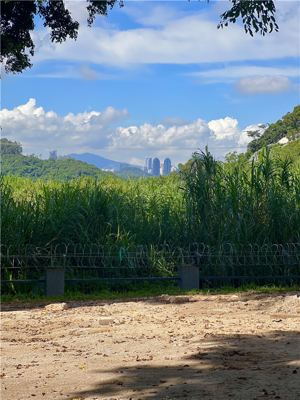 陽(yáng)光炙烤著大地,綠樹環(huán)繞成蔭,近處是生機(jī)盎然的灌木叢,遠(yuǎn)處是一派城市光景,別有趣味。
