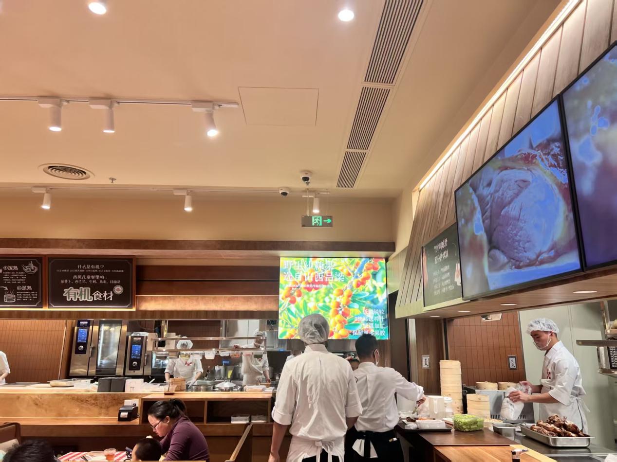 費大廚的聰明之處,在于將“現(xiàn)炒”從單純的烹飪工藝升級為可感知的品牌資產(chǎn),而明檔正是實現(xiàn)這一轉(zhuǎn)化的關(guān)鍵載體。不同于傳統(tǒng)后廚的“隱秘操作”,費大廚幾乎每家門店都有一個豬肉鋪明檔,一條條分割好的黑豬肉在明檔內(nèi)整齊懸掛,大廚手起刀落現(xiàn)場切片,各種時蔬和有機食材有序陳列,新鮮看得見。有些有條件的門店,直接能從明檔里看到大廚現(xiàn)炒。