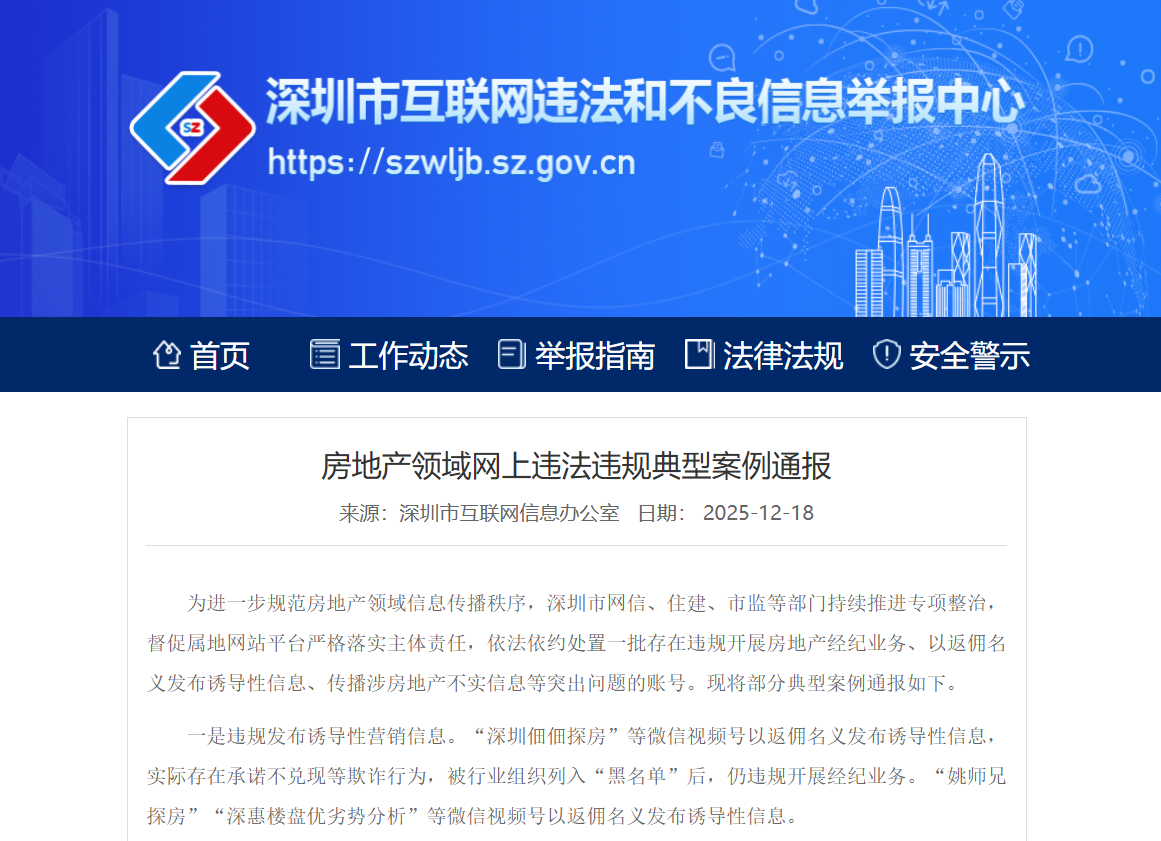 深圳新聞網(wǎng)2025年12月18日訊(記者 張小臣 魏梓晴)12月18日,記者從深圳市互聯(lián)網(wǎng)信息辦公室獲悉,為進一步規(guī)范房地產(chǎn)領域信息傳播秩序,深圳市網(wǎng)信、住建、市監(jiān)等部門持續(xù)推進專項整治,督促屬地網(wǎng)站平臺嚴格落實主體責任,依法依約處置一批存在違規(guī)開展房地產(chǎn)經(jīng)紀業(yè)務、以返傭名義發(fā)布誘導性信息、傳播涉房地產(chǎn)不實信息等突出問題的賬號,并通報了部分典型案例。