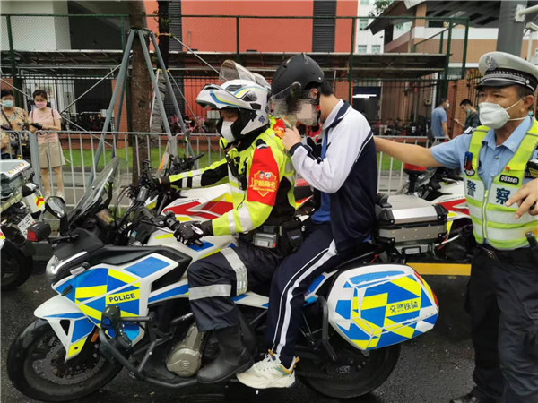 6月7日上午,深圳市第二實(shí)驗(yàn)學(xué)校考場(chǎng)外的一名高考生向交警求助護(hù)送。羅湖交警獲悉該情況后,迅速啟動(dòng)“綠色通道”護(hù)送。