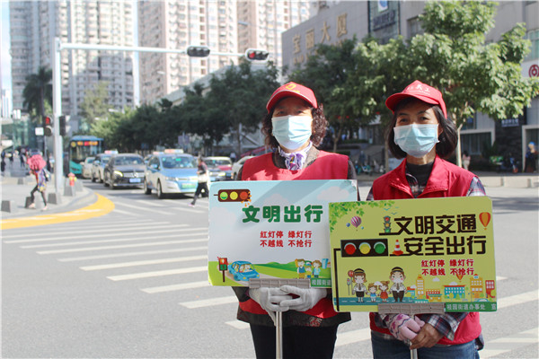 11月8日早晨,深圳明顯降溫,出行的市民紛紛穿上了厚衣御寒。身穿紅馬甲的義工,手舉“文明出行”的指示牌,在四面迎風的路口執(zhí)勤,勸導市民文明出行,營造安全有序暢通的交通環(huán)境。