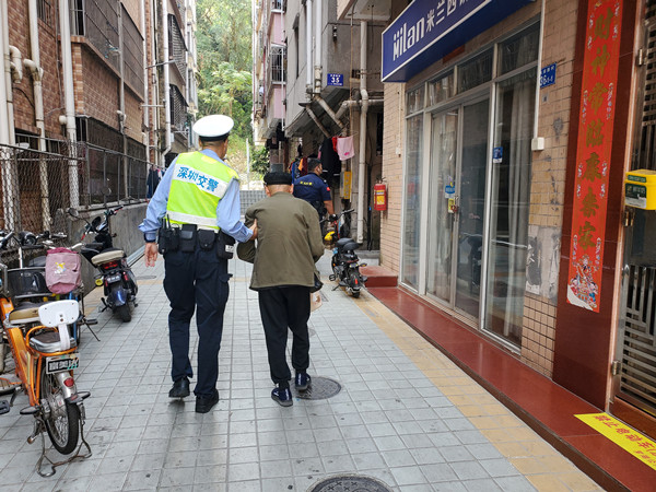 11月11日,在德智路沿河北路口附近,羅湖交警遇到一位年邁的老人求助,老人獨自外出逛公園,結(jié)果找不到回家的路。羅湖交警熱心相助護送老人回家。