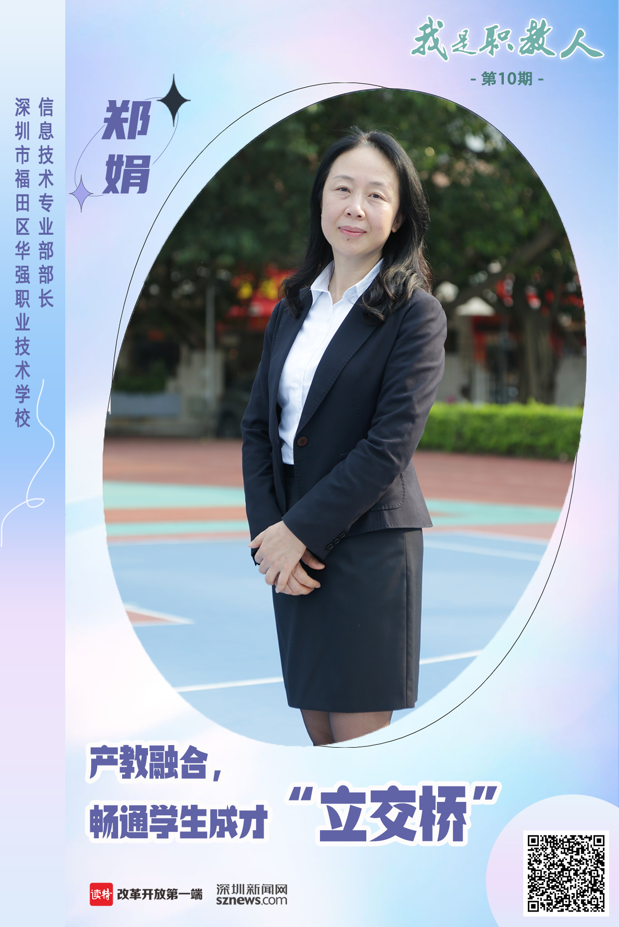 父母的耳濡目染,讓她選擇成為一位教師;職業(yè)教育發(fā)展的重要性,讓她成為了一名職教人,她是深圳市福田區(qū)華強(qiáng)職業(yè)技術(shù)學(xué)校(以下簡(jiǎn)稱(chēng)“華強(qiáng)職?!保┬畔⒓夹g(shù)專(zhuān)業(yè)部部長(zhǎng)鄭娟。